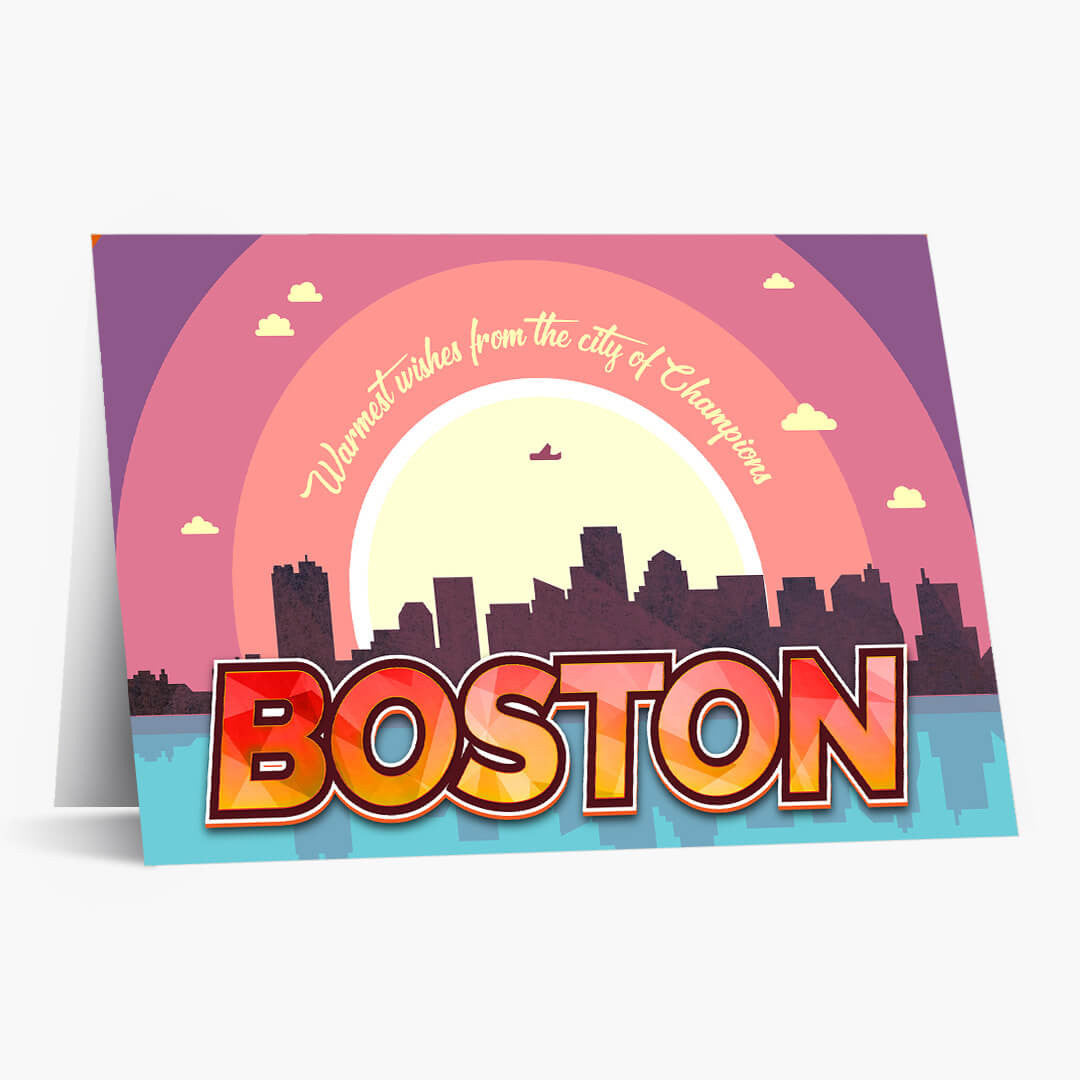 A vibrant retro sunset washes over Boston’s iconic skyline in this holiday card, where bold 'BOSTON' text overlays a dramatic blend of purple, pink, yellow, and blue. The cityscape silhouette and harbor glow with gem-like colors, capturing the city's energetic spirit and championship pride.