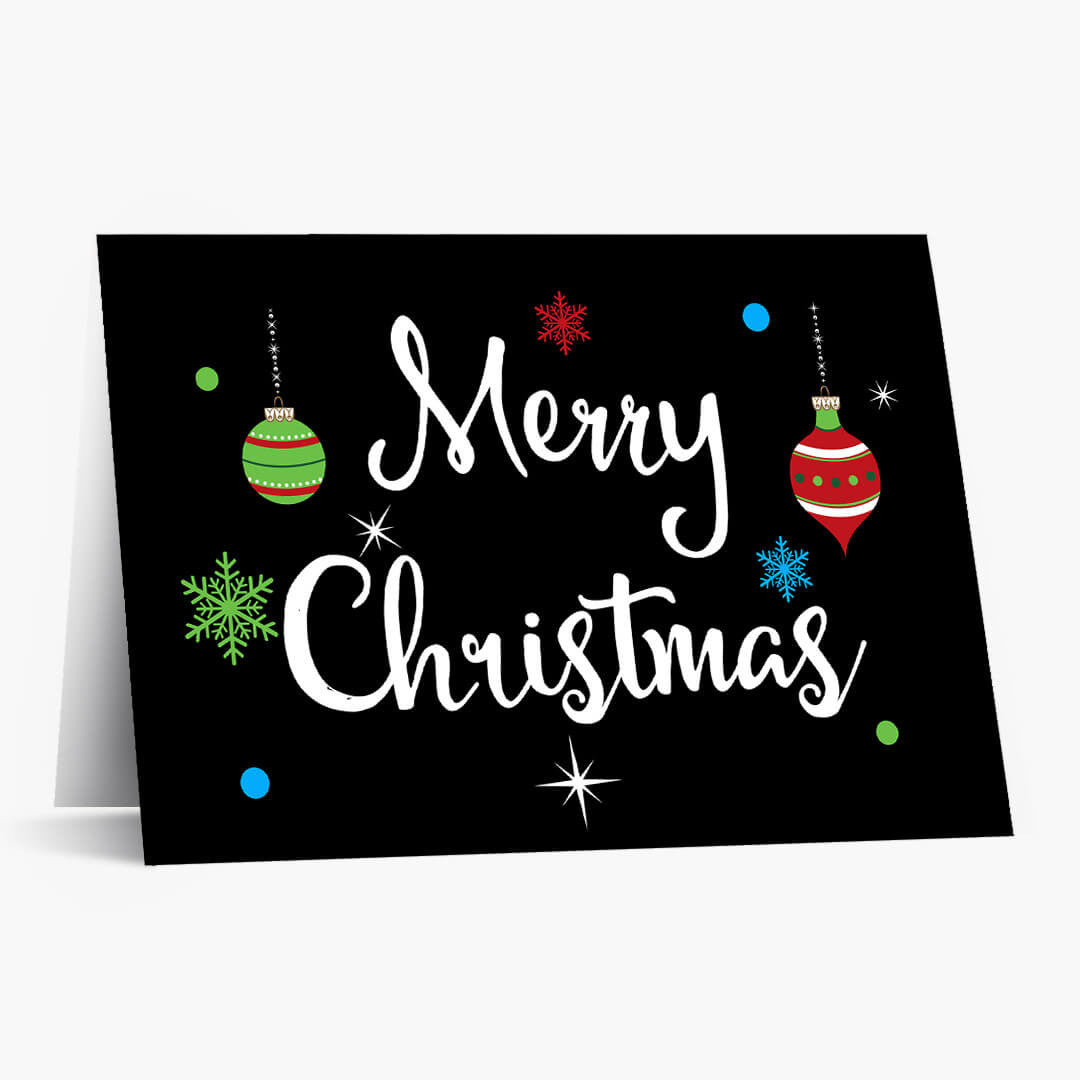 Brighten the season with a festive burst of color on this Christmas card. A bold white script pops against a striking black backdrop, playfully surrounded by illustrated ornaments, delicate snowflakes, stars, and vibrant dots in vivid red, green, and crisp white.
