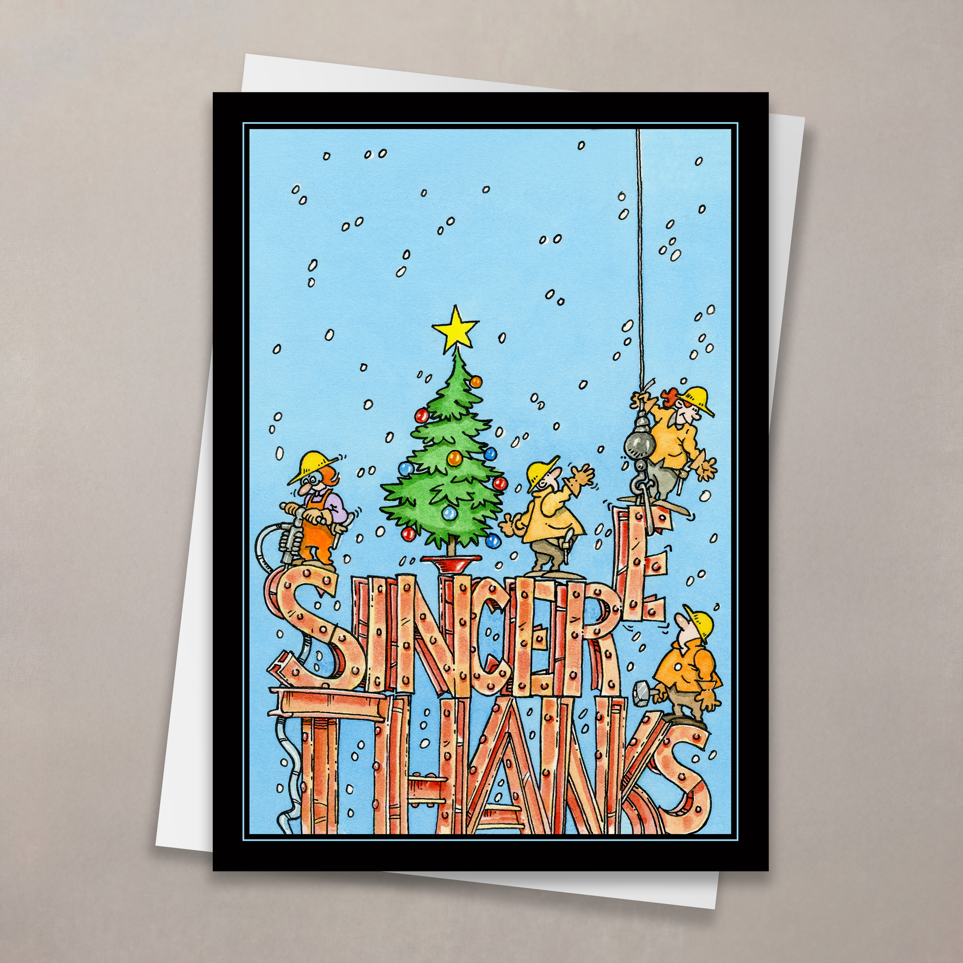 Bring festive cheer and gratitude together with this whimsical holiday card, featuring playful cartoon construction workers assembling oversized “SINCERE THANKS” letters beneath a snow-dusted Christmas tree. Animated figures in cheerful hard hats work amidst bold blue, yellow, green, and red hues, creating a lively winter construction scene.