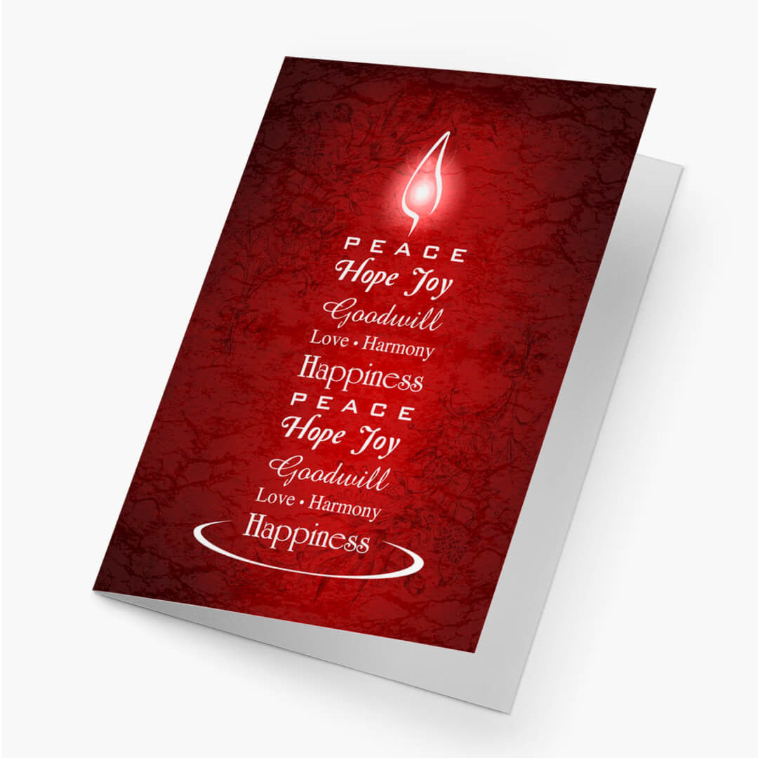 Radiating warmth and positivity, this holiday card features a striking minimal design where uplifting words like “peace,” “joy,” and “harmony” sculpt the elegant shape of a candle set aglow by a delicate flame. Subtle black floral sketches provide graceful accents over a rich burgundy and dark maroon backdrop, evoking both sophistication and seasonal cheer.