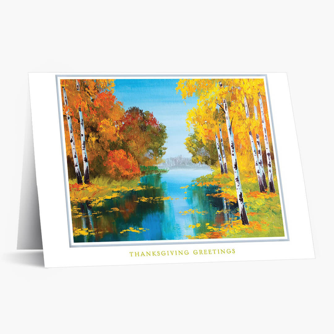 Capture the essence of the season with a Thanksgiving card featuring a vibrant autumn landscape. Painted birch trees glow in golden yellow, fiery orange, and lush green, all mirrored by the tranquil blue river that winds through the scene.