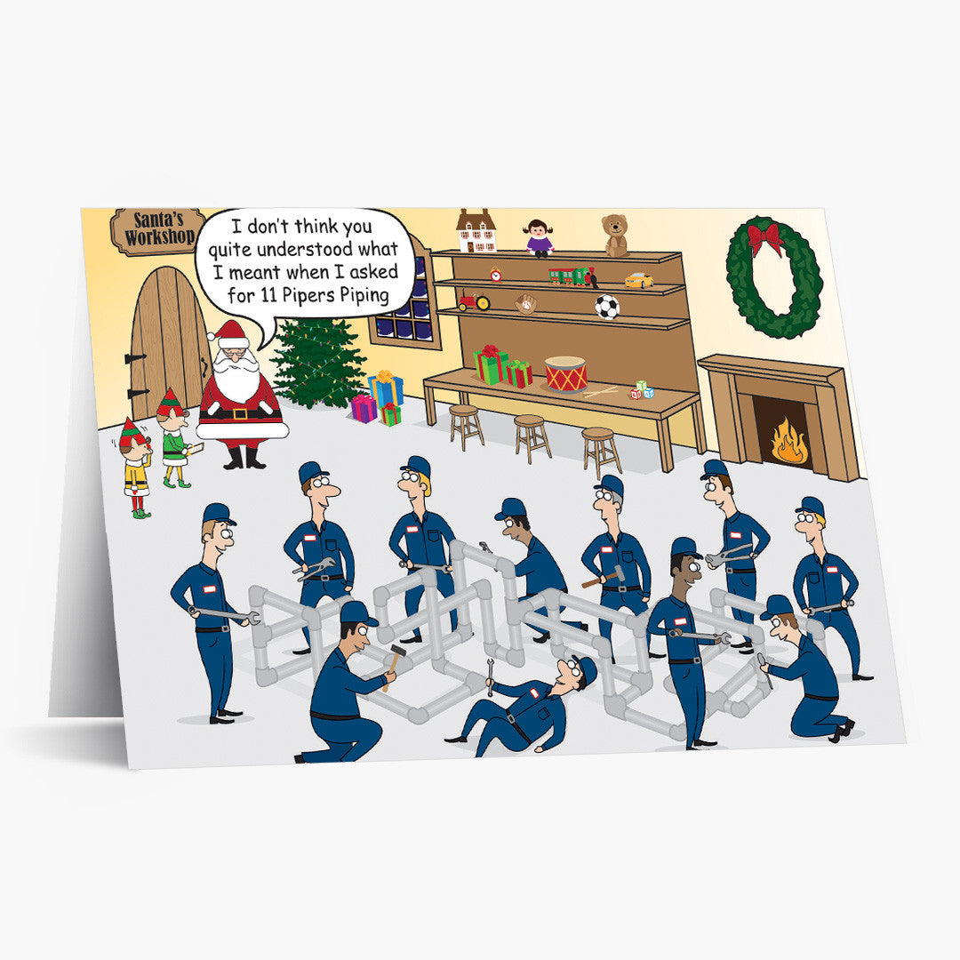 A whimsical twist on a holiday classic, this holiday card features a lively cartoon illustration of Santa's workshop bustling with elves and cheerful plumbers assembling pipes amidst festive Christmas decorations. Santa himself looks on with a humorous expression, highlighting a delightful misunderstanding in this playful scene.