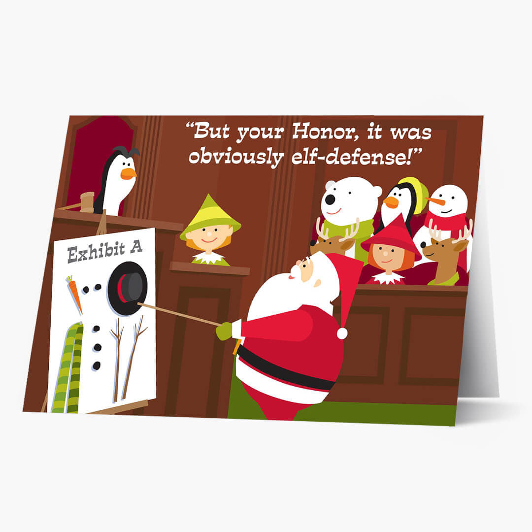 This whimsical Christmas card features a playful illustration of a humorous courtroom scene, where Santa Claus takes on the role of lawyer, passionately presenting evidence on behalf of a cheerful elf. Festive characters—such as a judge Penguin, a polar bear, a second penguin, and a snowman—compose the jury, adding to the lighthearted spirit.