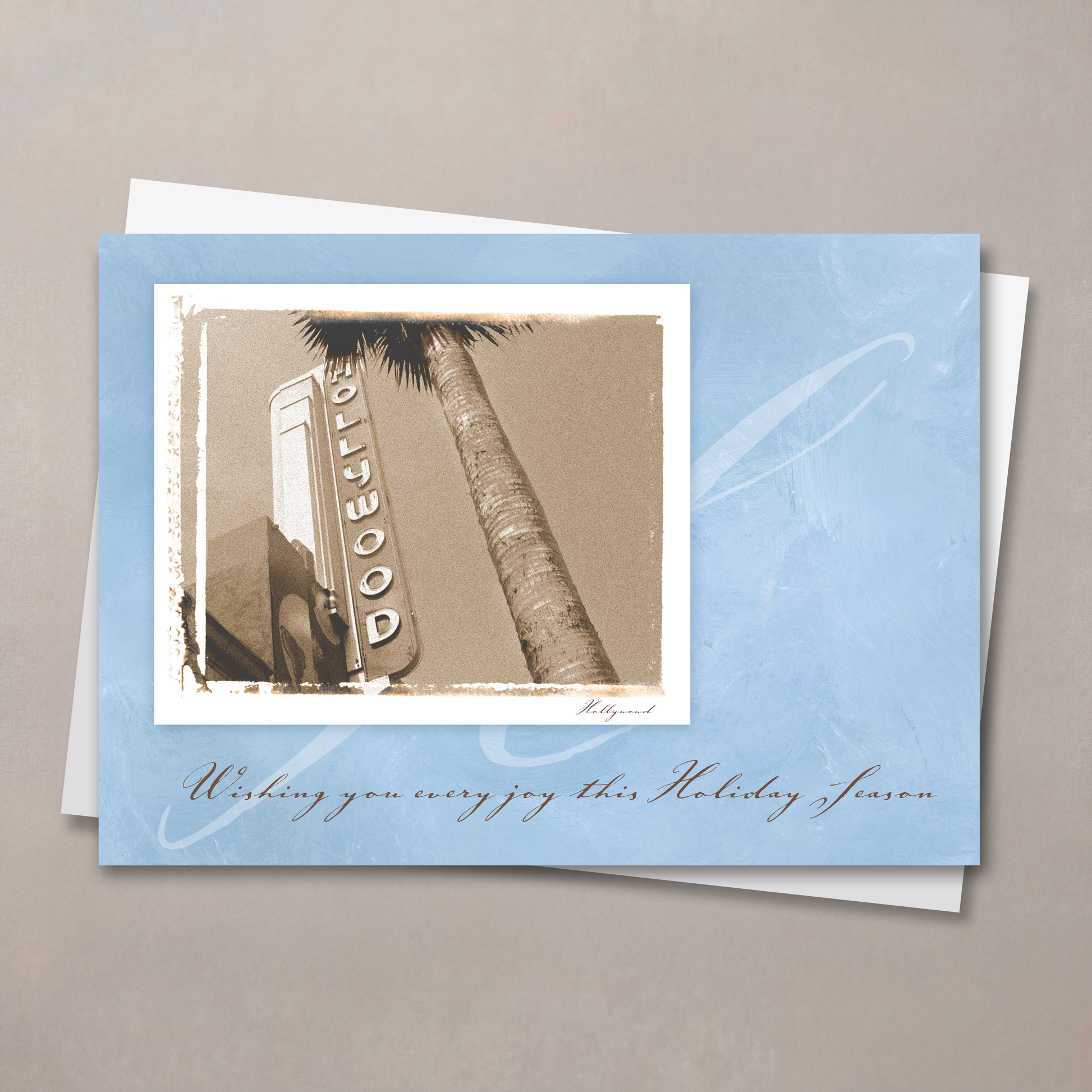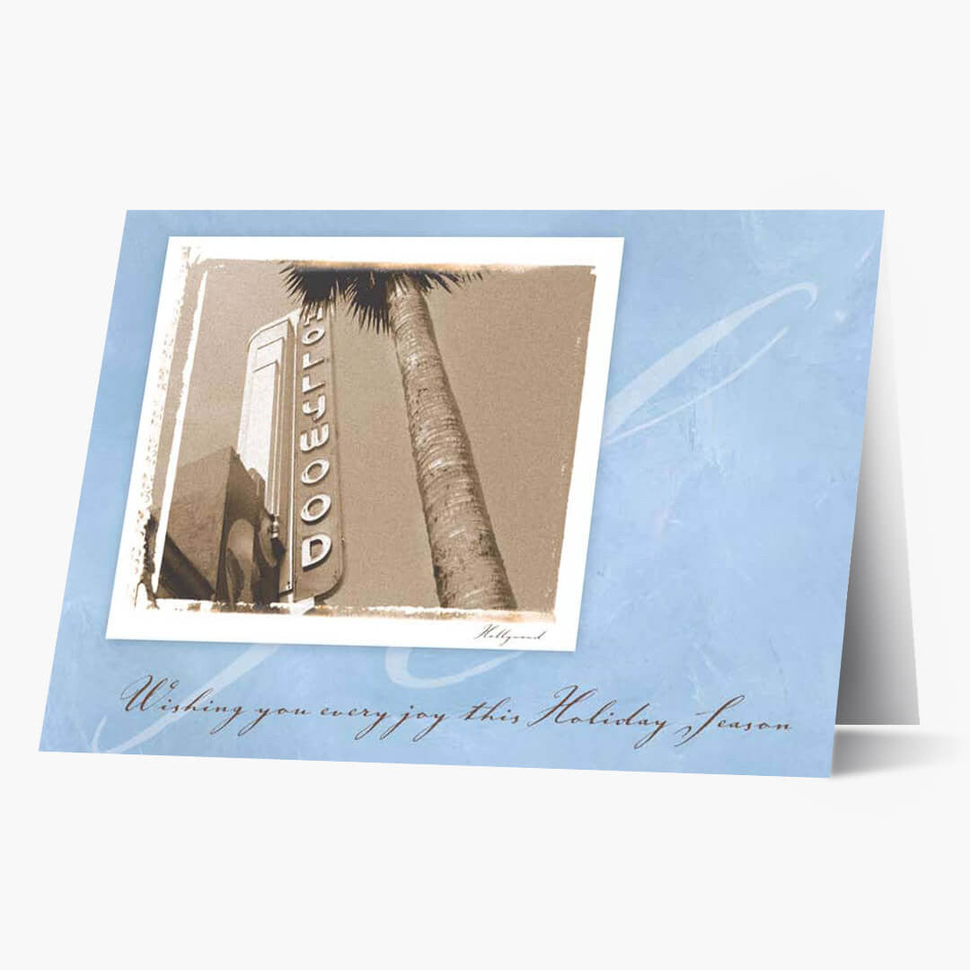 Capture the glamour of the silver screen with this holiday card, featuring a nostalgic sepia-toned photo illustration of the iconic Hollywood sign and graceful palm tree. The image is beautifully framed against a textured light blue background, evoking classic charm and timeless elegance.
