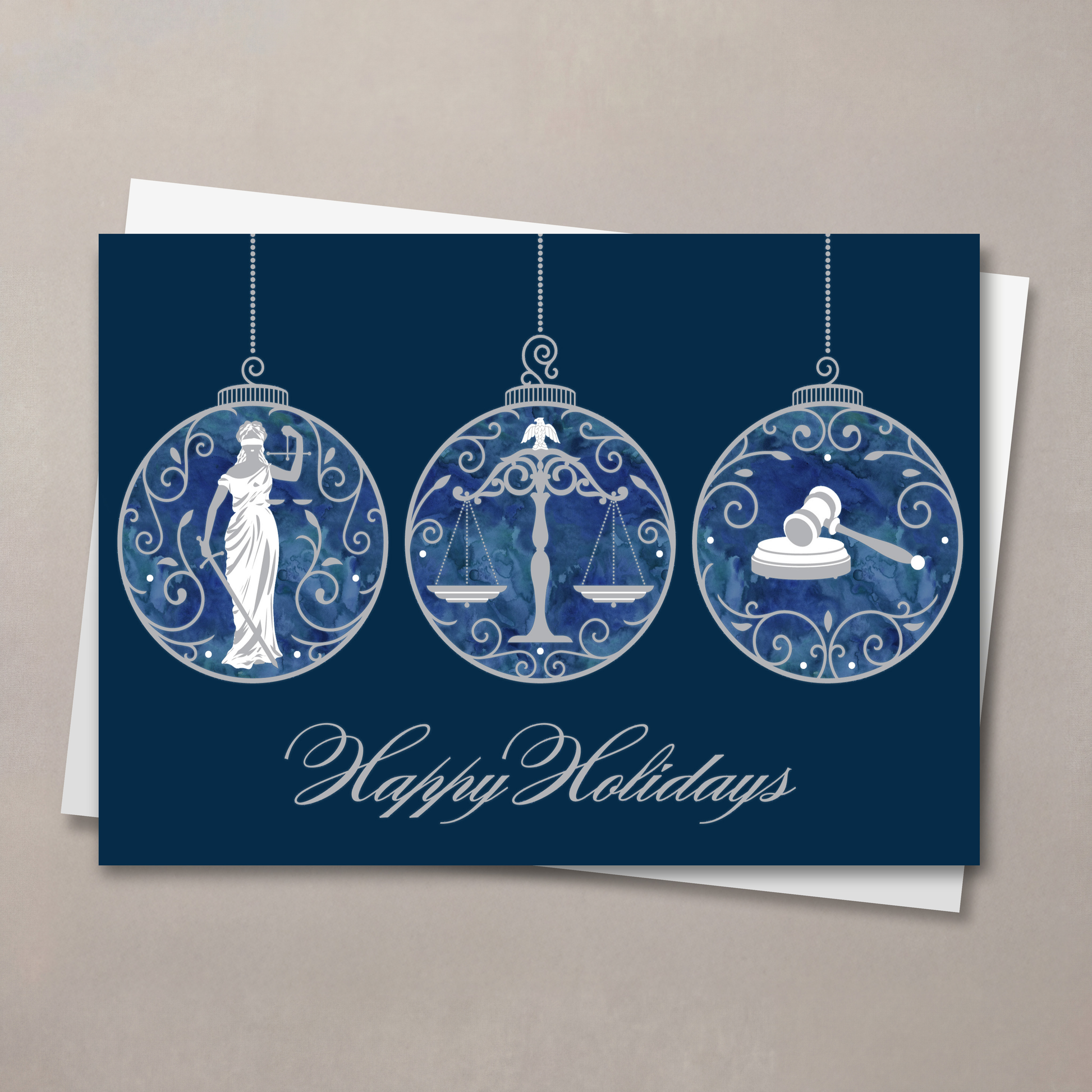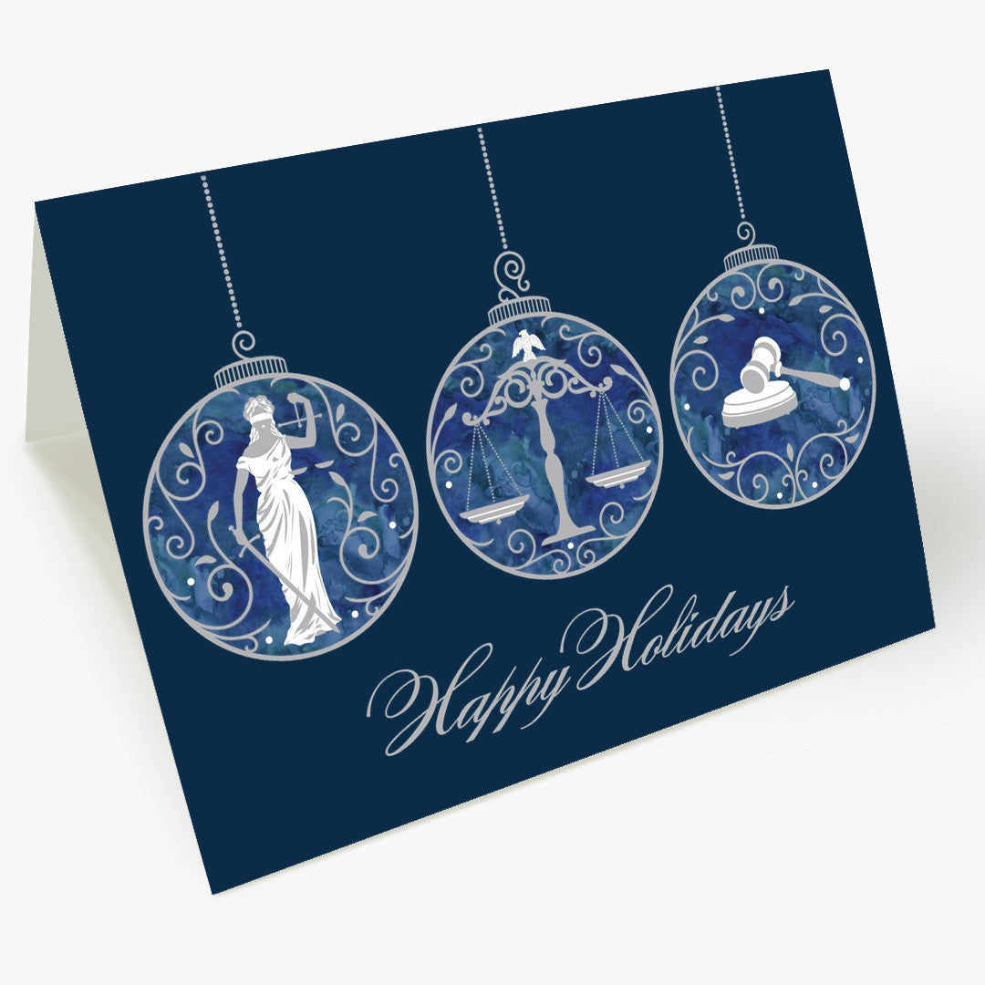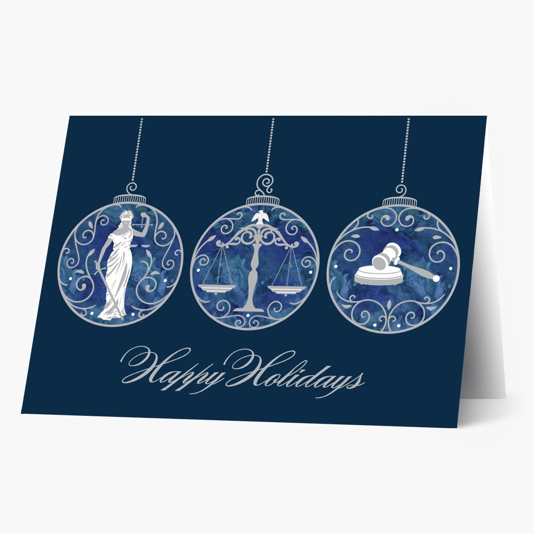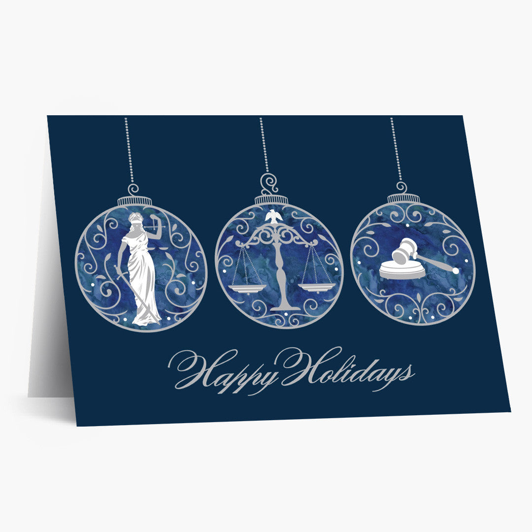 This holiday card exudes refinement with a trio of illustrated ornaments, each adorned with classic legal symbols—Lady Justice, the scales of justice, and a gavel. Set against a deep navy blue background, the crisp white and silver tones evoke a crisp, wintry elegance.