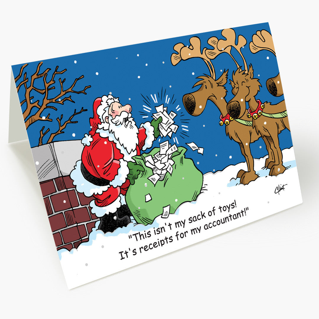 The playful scene captures the humorous side of holiday mix-ups, making it a standout Christmas card for accounting professionals and anyone who enjoys a festive laugh.