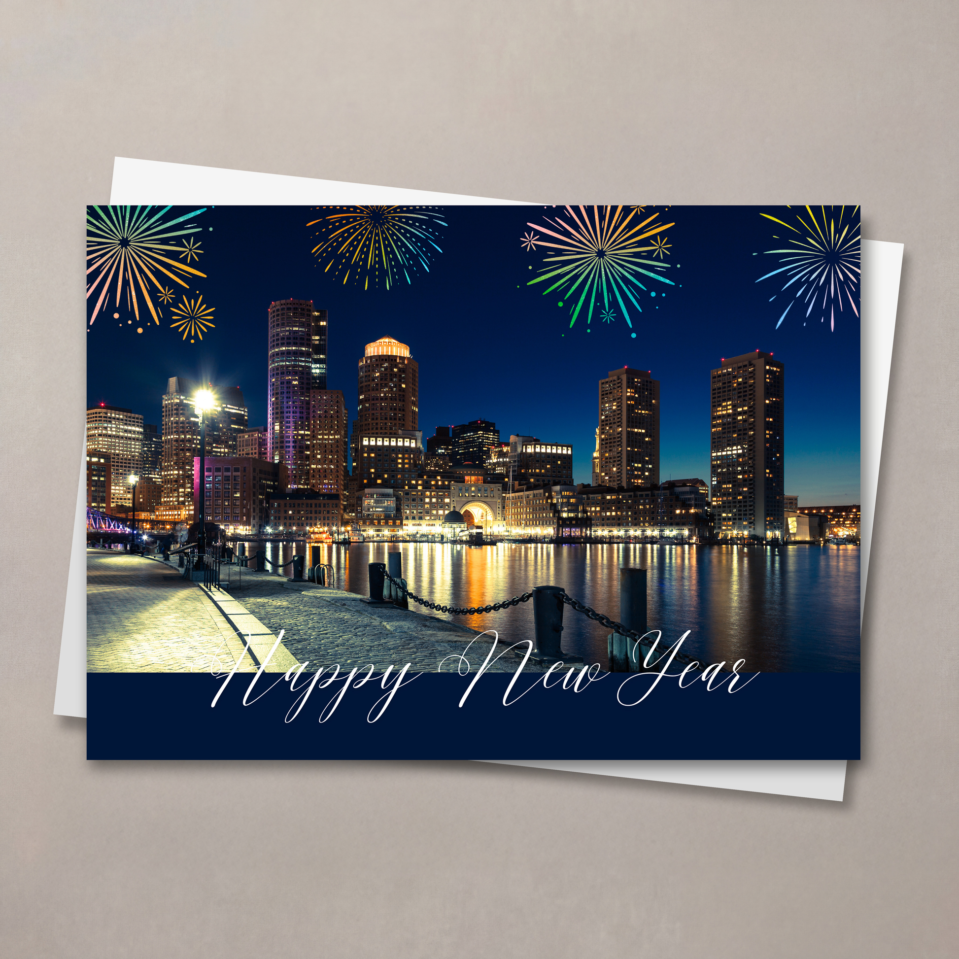 Celebrate new beginnings with this festive new year card, featuring a dazzling Boston city skyline illuminated by colorful fireworks. The vibrant photo captures the city’s waterfront aglow at night, blending rich navy blue with pops of yellow, purple, and green.