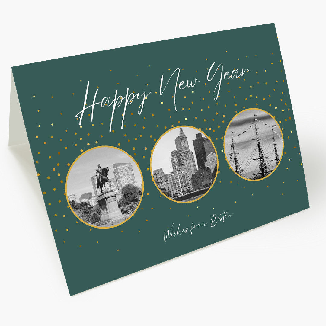 Celebrate the spirit of Boston with a modern new year card featuring a striking photo collage. Three circular black-and-white images—a city skyline, a historic ship, and a famed statue—stand out against a deep green background, artfully bordered by shimmering gold dots for a festive touch.