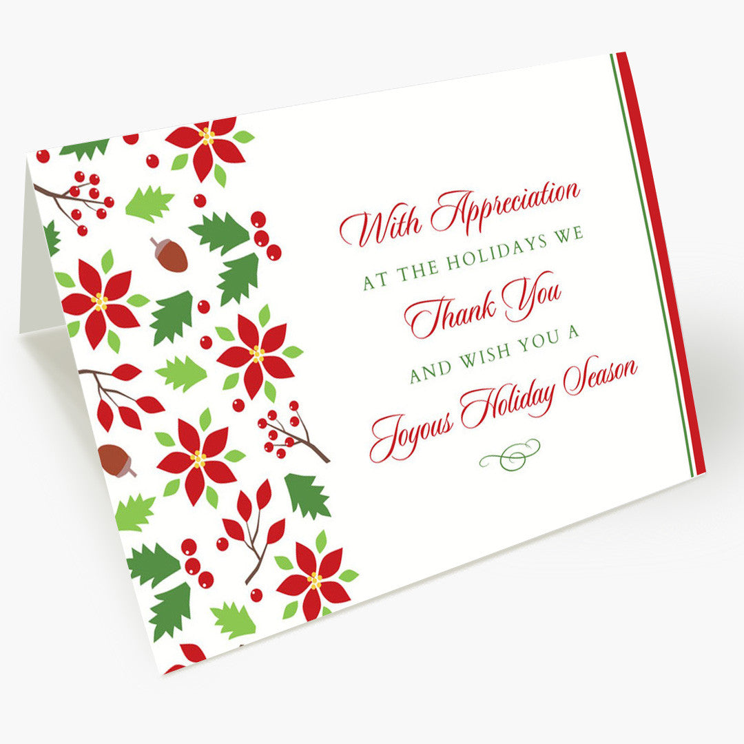 This festive holiday card captures the warmth of the season with a border of illustrated red poinsettias, holly leaves, berries, and acorns, all beautifully arranged along the left side. The vibrant red and green hues contrast elegantly with a clean white background, creating a sense of refined holiday cheer.
