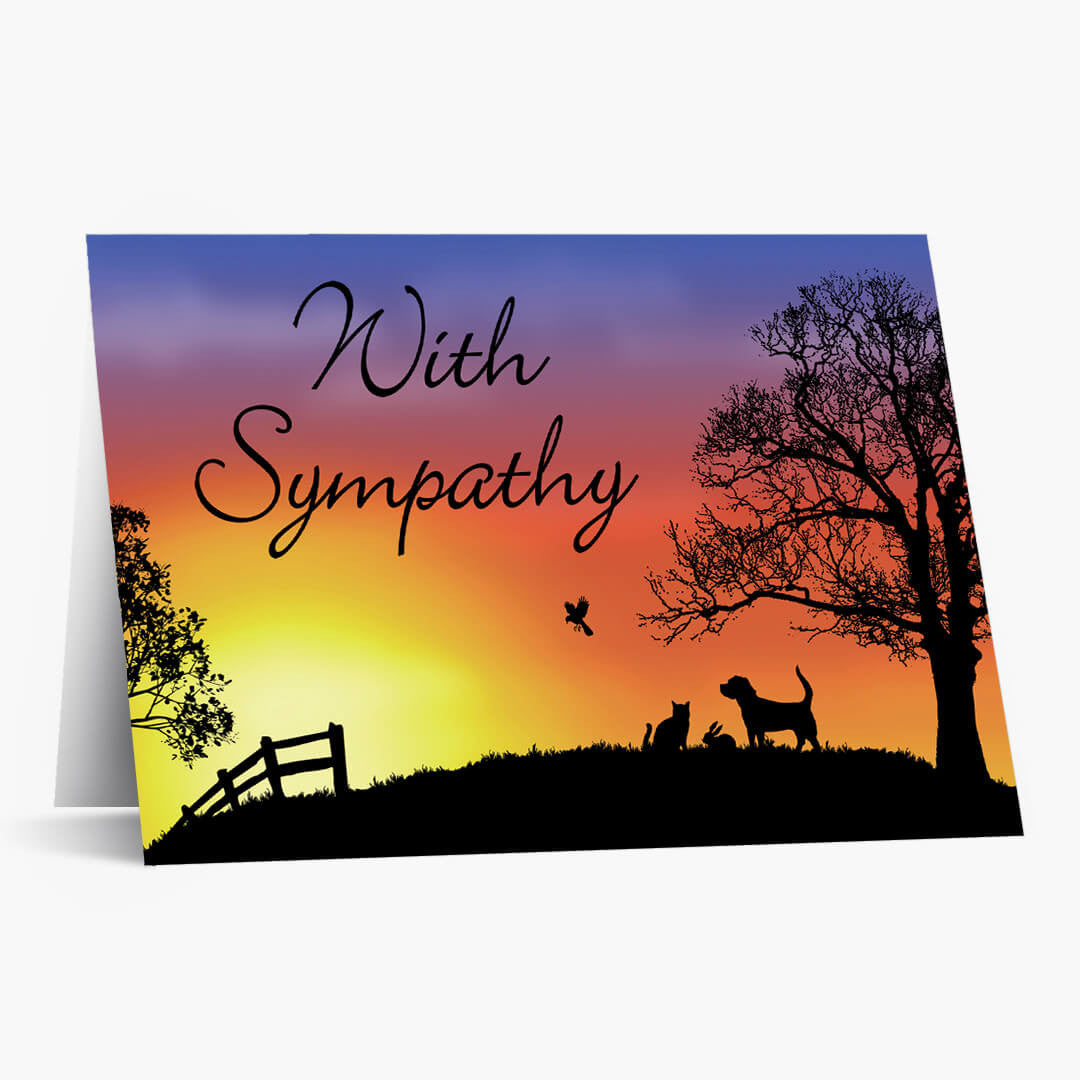 The evening palette paired with the delicate animal motifs offers comfort and remembrance, making this sympathy card a considerate way to honor a cherished companion.