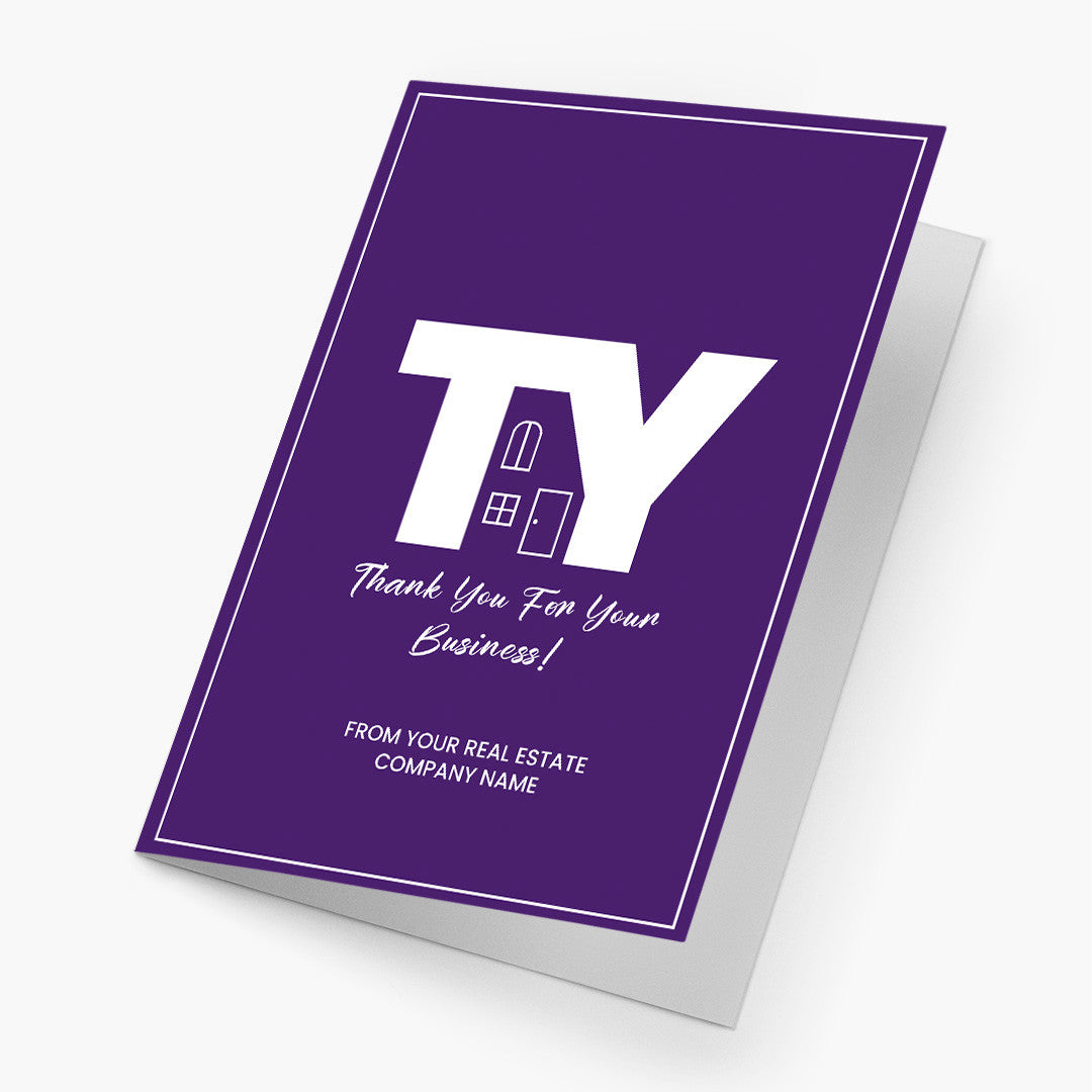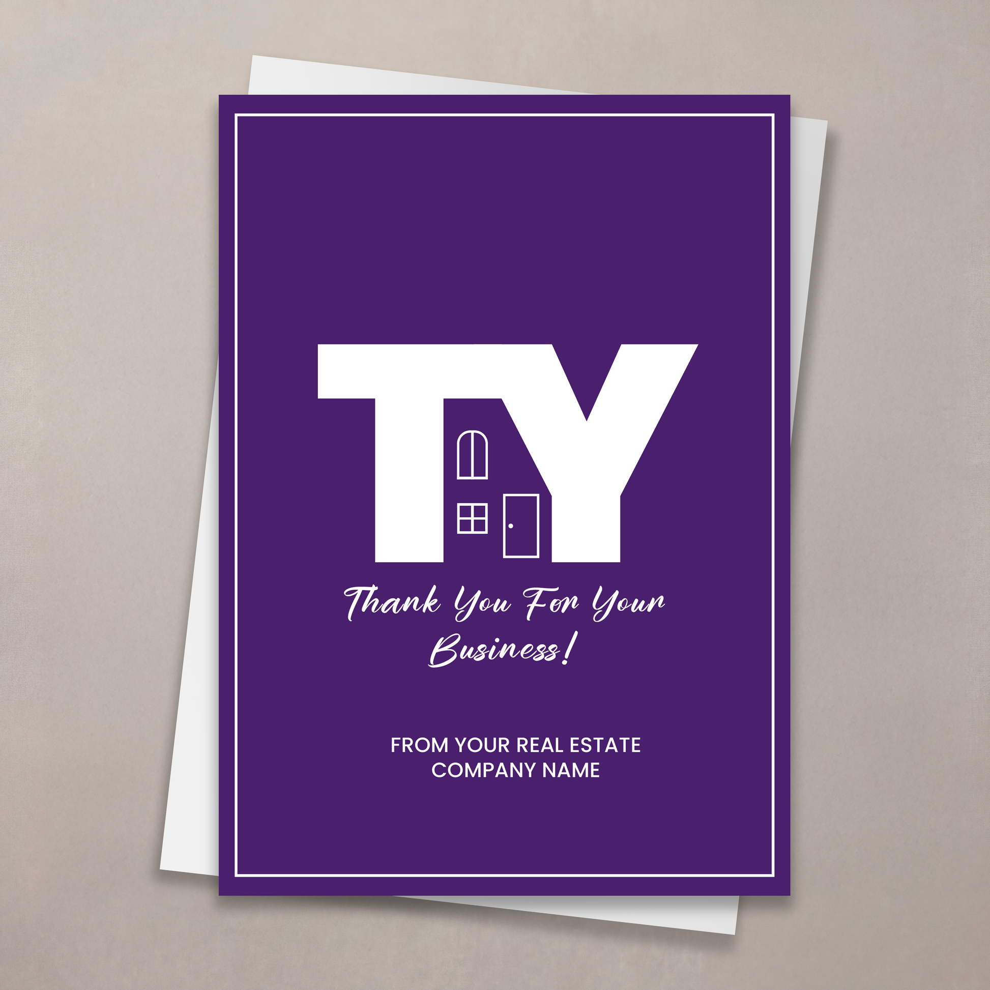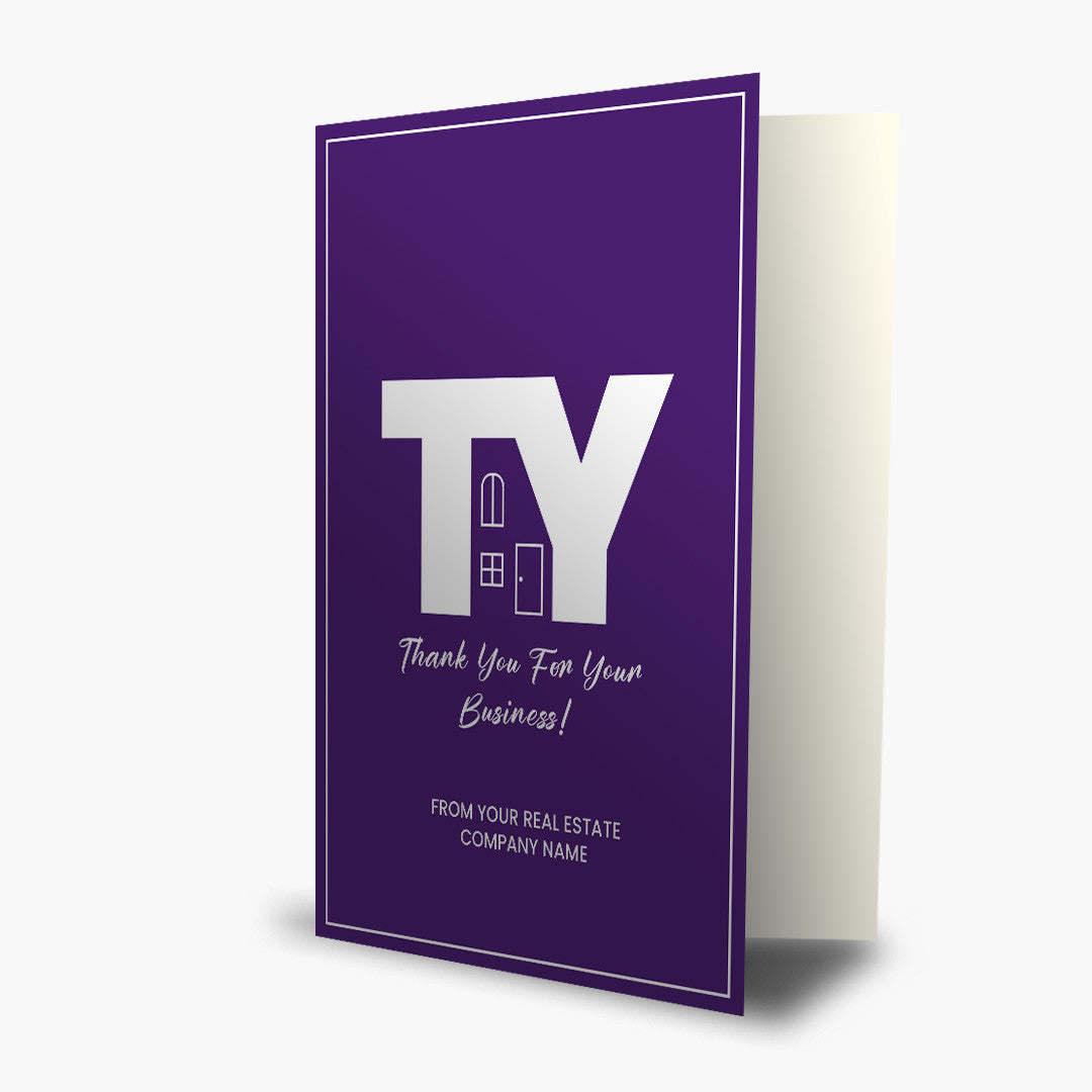 Bold and contemporary, this thank you card features a large 'TY' artfully integrated with charming house motifs including a window and door. The minimal design is elevated by a modern palette of rich purple and clean white, lending the card a stylish and inviting presence.