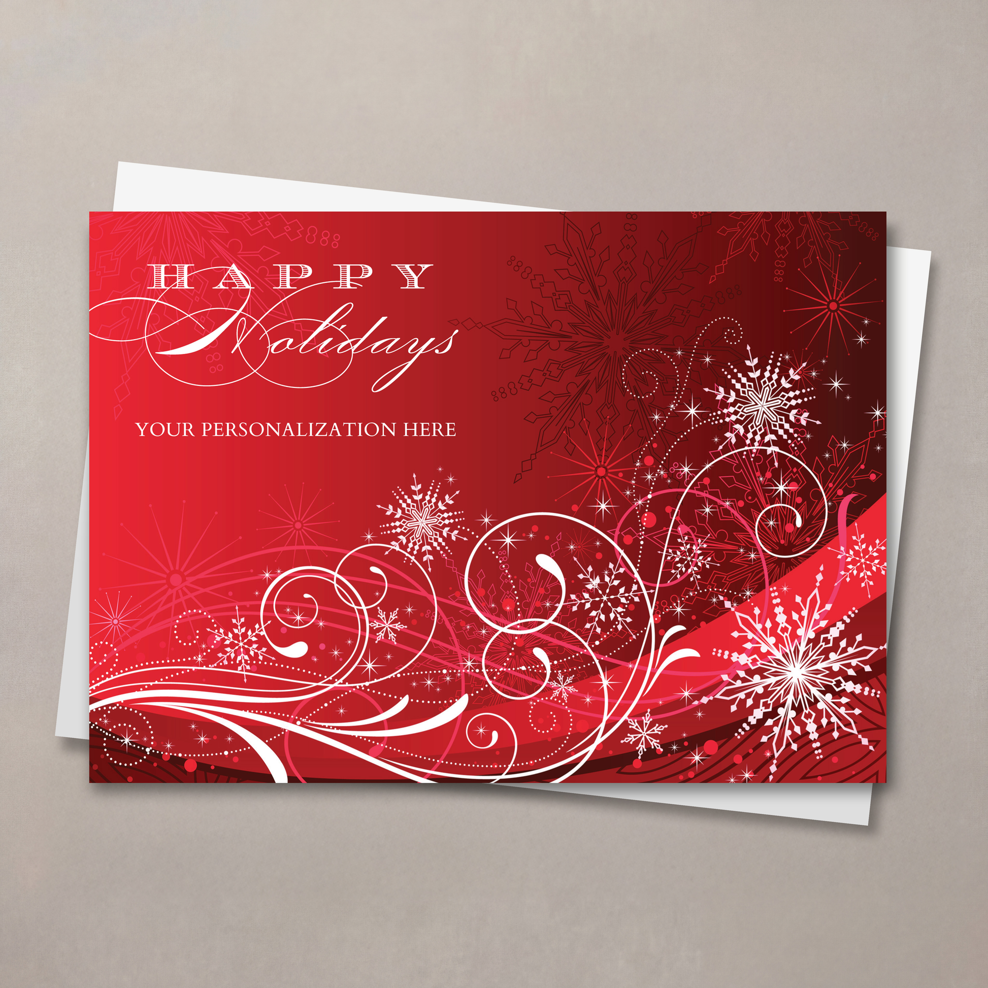 Bursting with festive energy, this holiday card features elegant white snowflakes and swirling lines illustrated across a rich red gradient. Silver accents mingle with star motifs, creating a lively, enchanting composition that evokes the joy of the season.