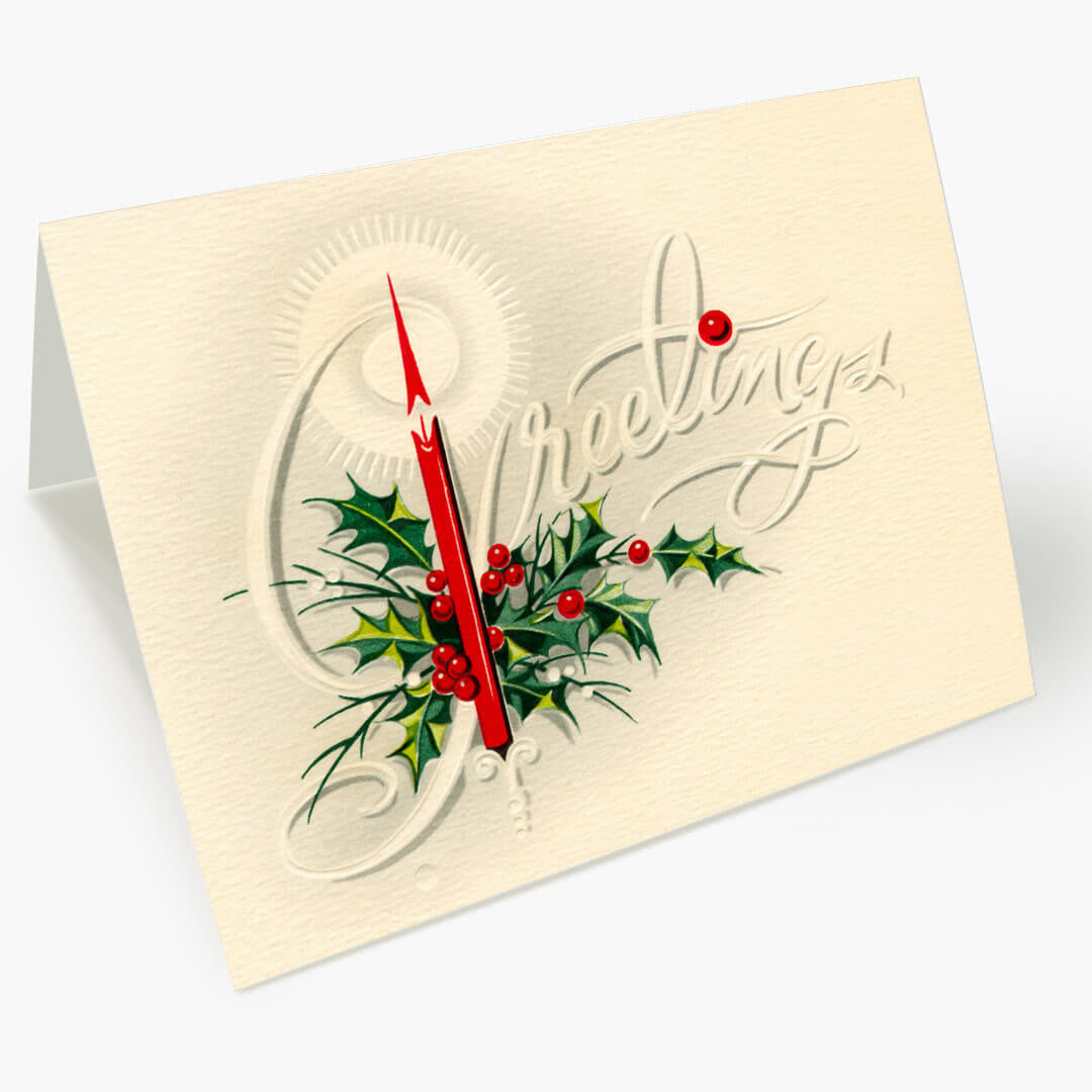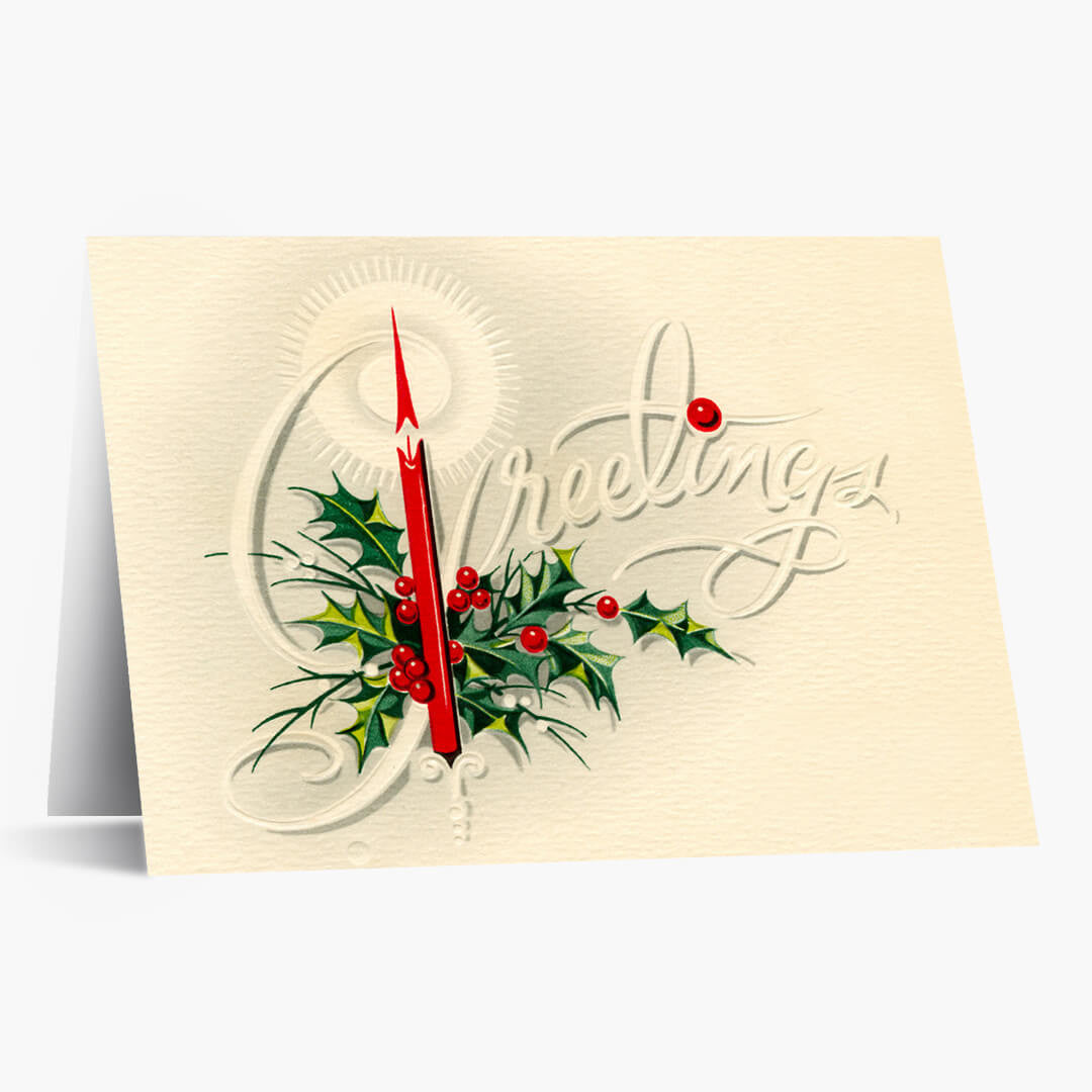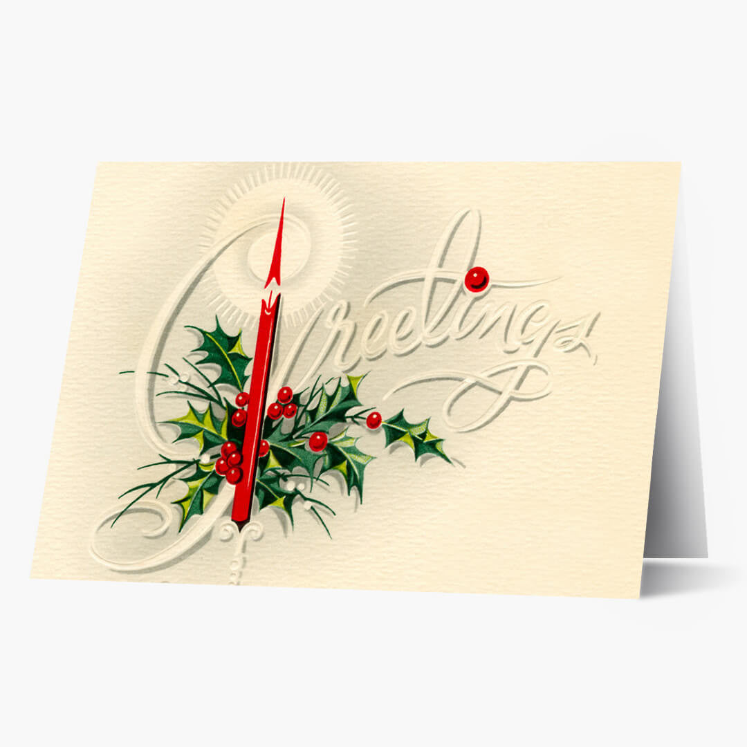 Elegant embossed script and candle details add a tactile dimension, enhancing the vintage artistry and making this card both visually striking and invitingly traditional.