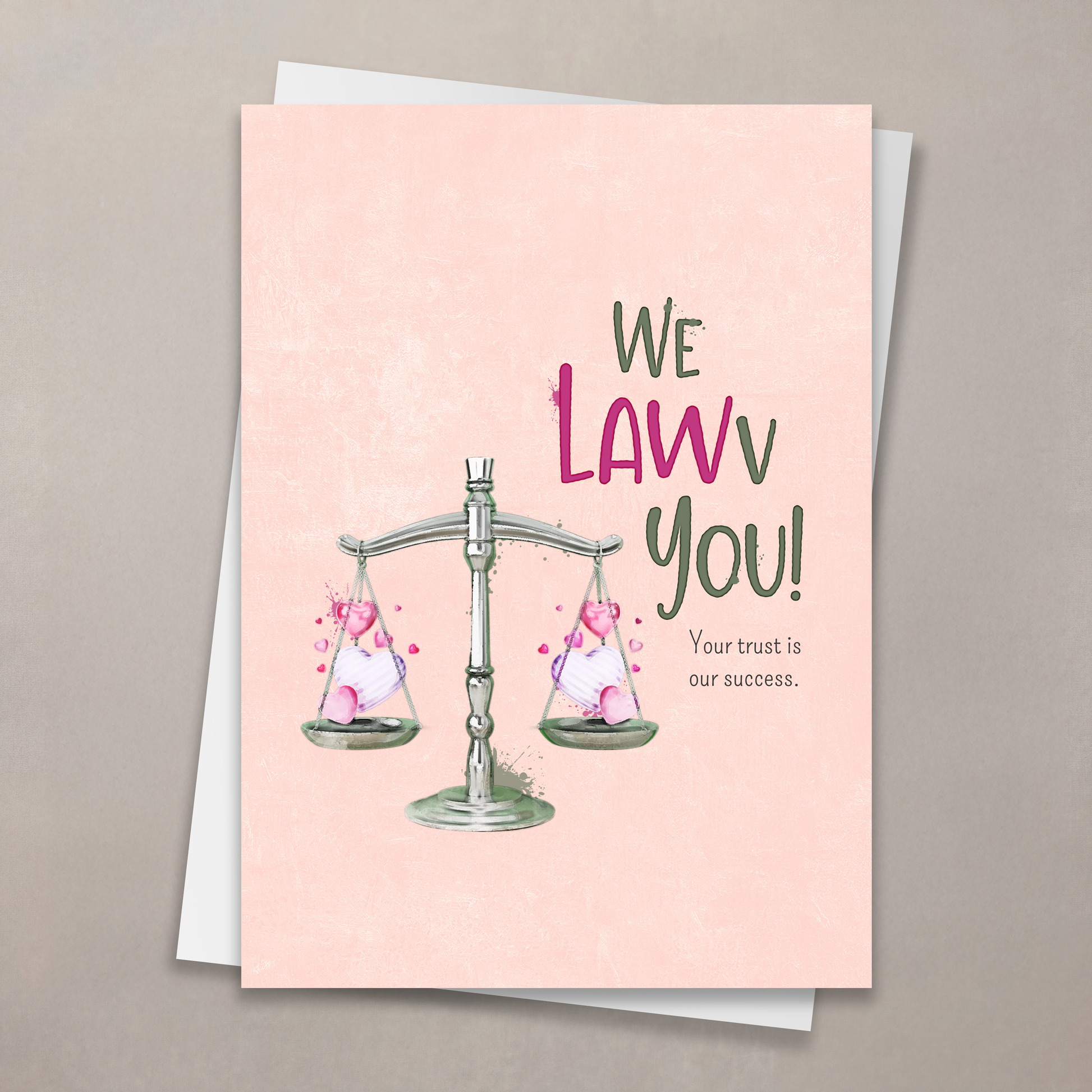 Charming whimsy meets professional flair in this Valentine's card, where two illustrated cats balance gracefully on the scales of justice. The playful pink accents and soft green touches pop against a textured pastel background, creating an engaging scene filled with warmth and character.