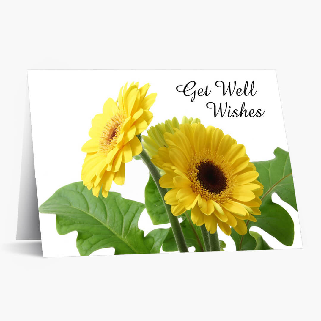 Send a burst of warmth and encouragement with this get well card featuring two vibrant yellow daisies surrounded by lush green leaves. The photo-style artwork uses a cheerful palette of yellow, green, and white, evoking brightness and positivity against the crisp background.