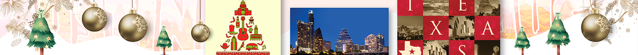 Card senders and recipients in Austin and the surrounding region can appreciate Austin Christmas cards. This city has retained a distinctive culture even during an ongoing period of rapid growth. No matter what you love about Austin and want to celebrate on the occasion of the holiday season, you can save on bulk orders of city or regionally themed themed Christmas cards.