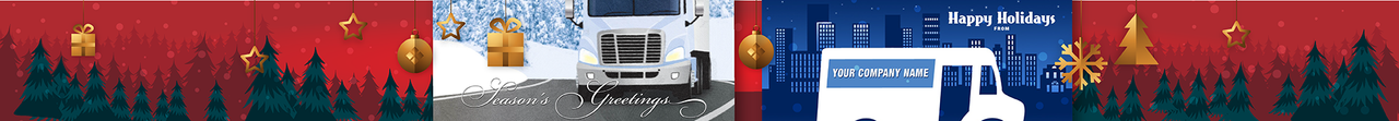 The trucks that are most commonly used to make deliveries over any distance tend to have a distinctive shape compared to big rigs, dump trucks and other types of transportation. The low frame and wide doors of delivery vehicles stand out in an animated design or stylized silhouette display. No matter which types of trucks are in a fleet, the owner of a service can select the closest match from an extensive selection of Christmas cards.